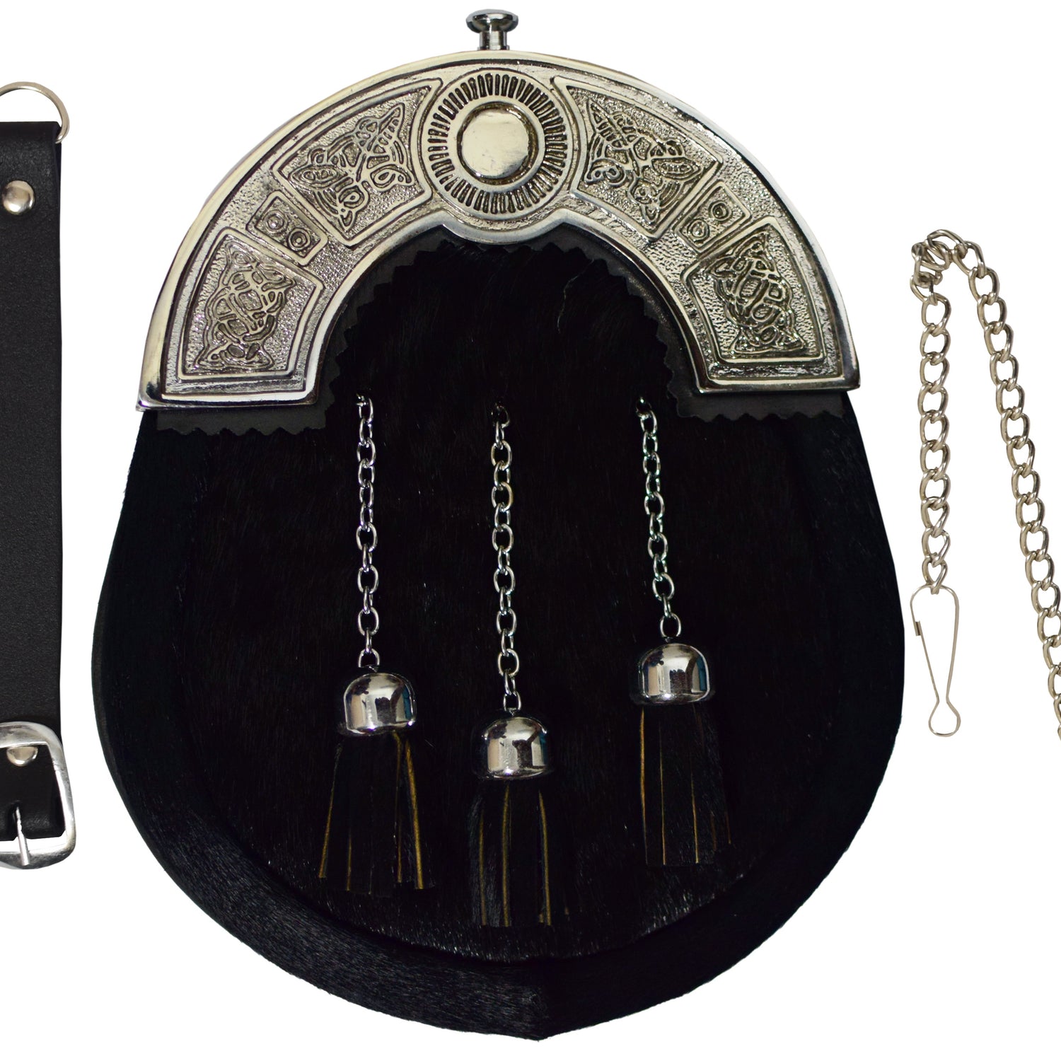 HOW TO WEAR: A sporran is worn at the front of your kilt and should sit centre to your waistcoat. It should be sitting just underneath your waistcoat, but not touching. The leather straps at the end of the chain strap fasten together at the back and can be put through the kilt straps. The chain straps should always sit on top of the belt buckles to ensure the sporran does not fall down!