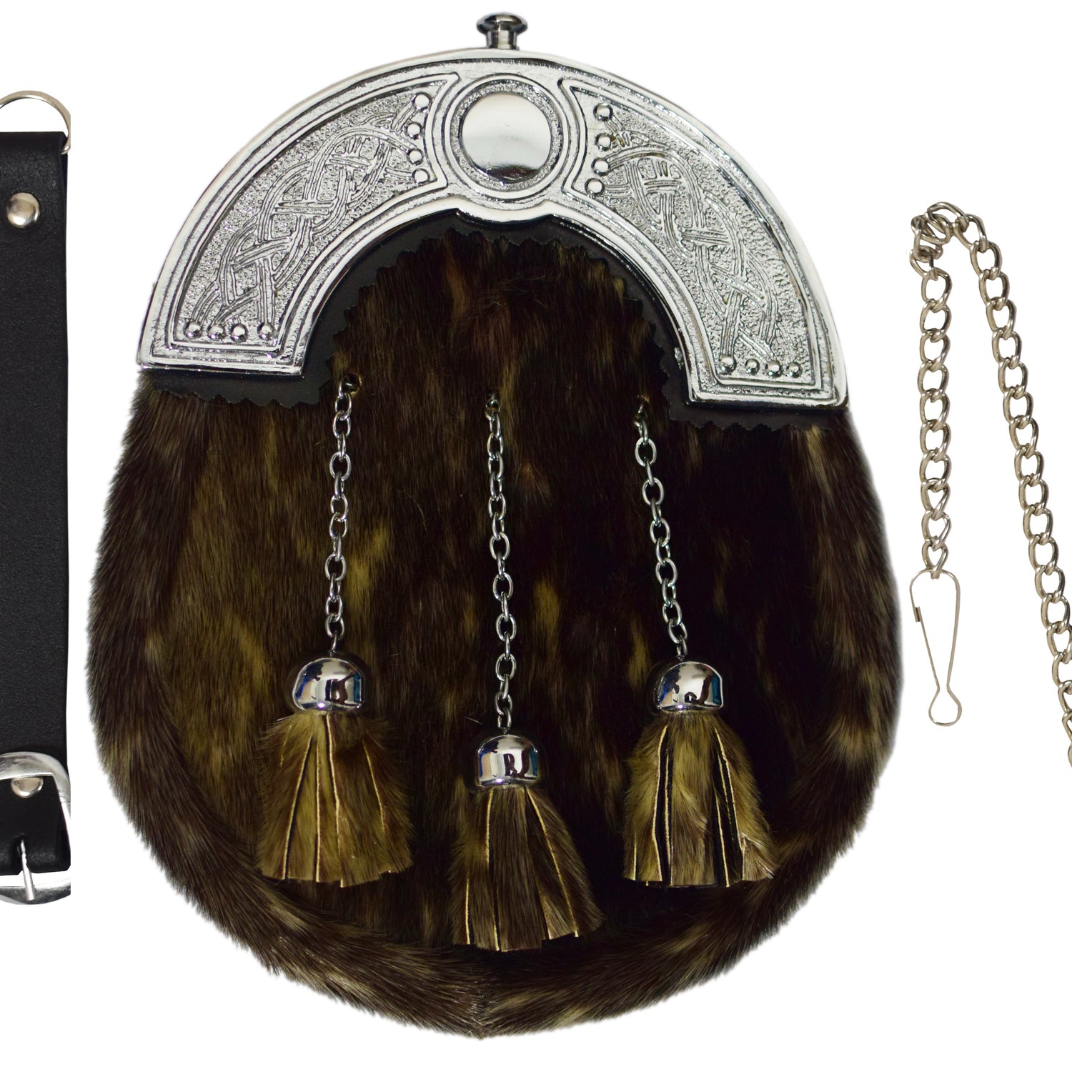 HOW TO WEAR: A sporran is worn at the front of your kilt and should sit centre to your waistcoat. It should be sitting just underneath your waistcoat, but not touching. The leather straps at the end of the chain strap fasten together at the back and can be put through the kilt straps. The chain straps should always sit on top of the belt buckles to ensure the sporran does not fall down!