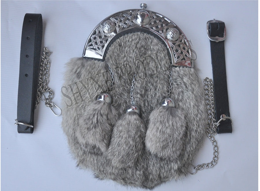 This sporran is handmade with the best quality leather & Grey rabbit fur to very high standards.
