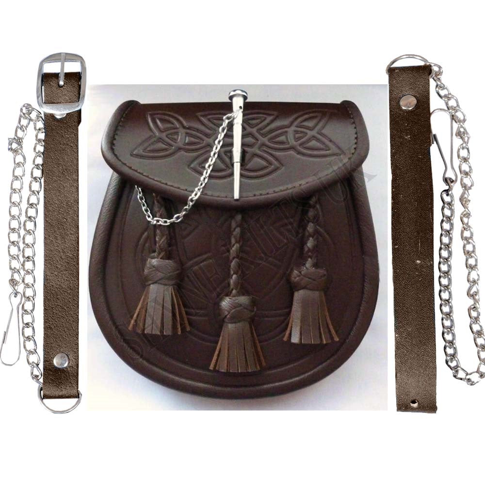 Arctic Unique sporrans made by professional craftsman experts in Scottish products. MATERIAL: Brown Leather Sporran. Celtic design with Latch PIN.  Free chain strap belt suitable for waists between 28" ~...