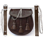 MATERIAL: Brown Leather Sporran. Celtic design with Latch PIN.