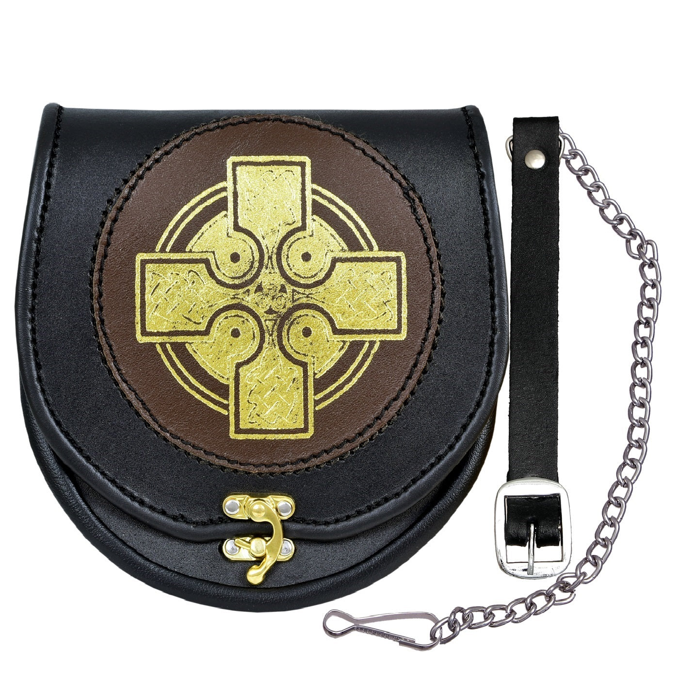 MATERIAL: This black leather sporran (brown leather center) features a gold cross design plus convenient latch closure.