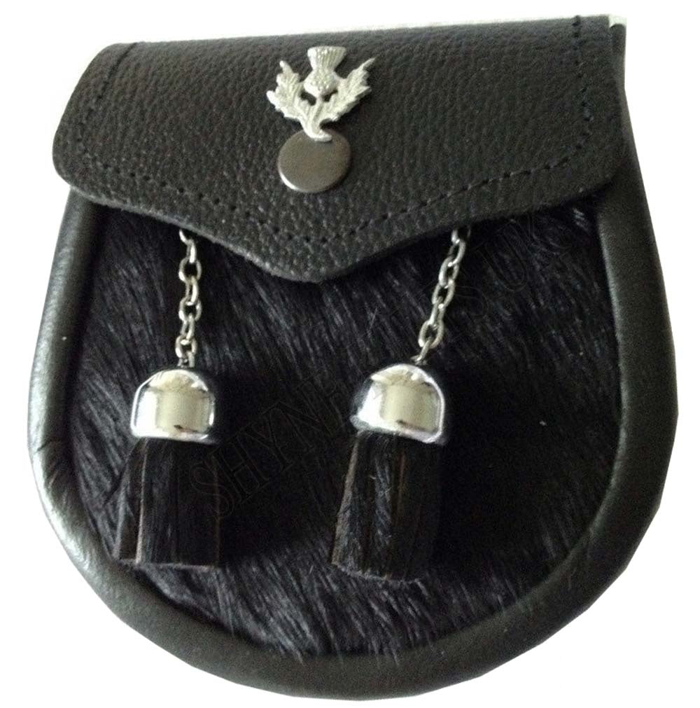 This amazing designed sporran is Brand New. This Half Dress Sporran is Black Cow Hide and is 4 inches across by 4.5 inches long. This comes with the sporran chain....