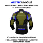Made from Cordura. Fully waterproof. Removable inner quilted lining. 2 Air vent on front & 2 at the back. CE Approved shoulder and elbow armour. Buttoned adjustable arm size. Buckled...