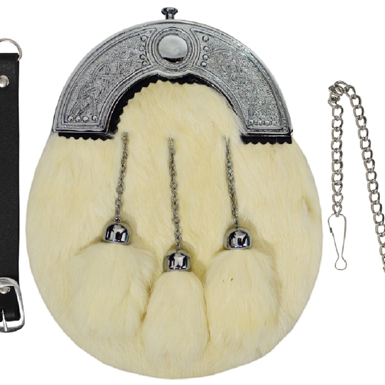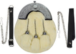 FULL DRESS KILT SPORRAN WHITE RABBIT FUR & CHROME CELTIC CANTLE
