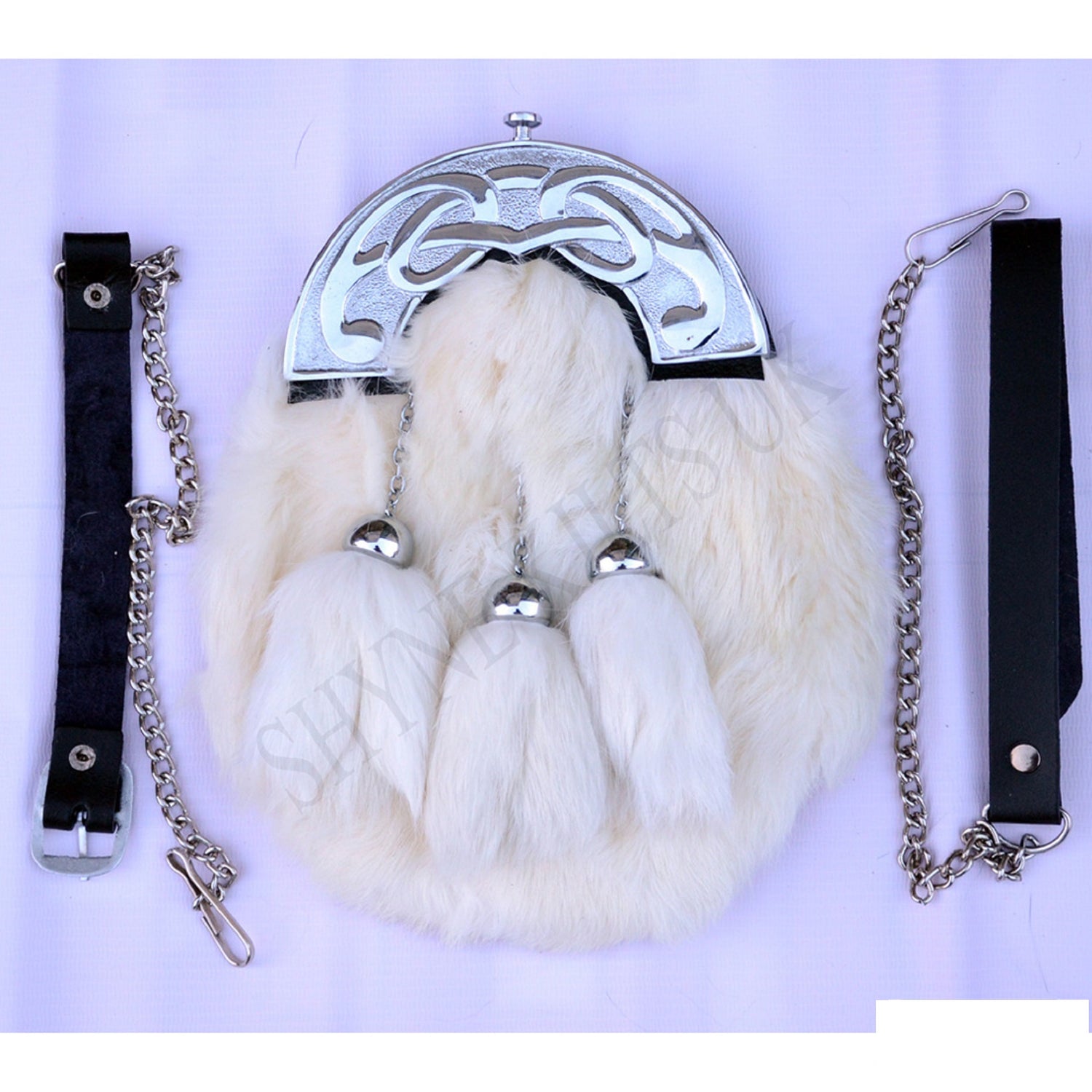 FULL DRESS SPORRAN WHITE RABBIT FUR & CHROME CELTIC CANTLE 3 BLACK TASSELS