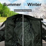 Made from Cordura. Fully waterproof. Removable inner quilted lining. 2 Air vent on front & 2 at the back. CE Approved shoulder and elbow armour. Buttoned adjustable arm size. Buckled...