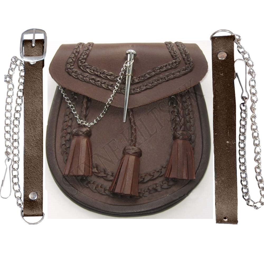 KILT SPORRAN BROWN LEATHER DROP PIN WOVEN DETAILED FRONT HIGHLANDWEAR FOR KILTS