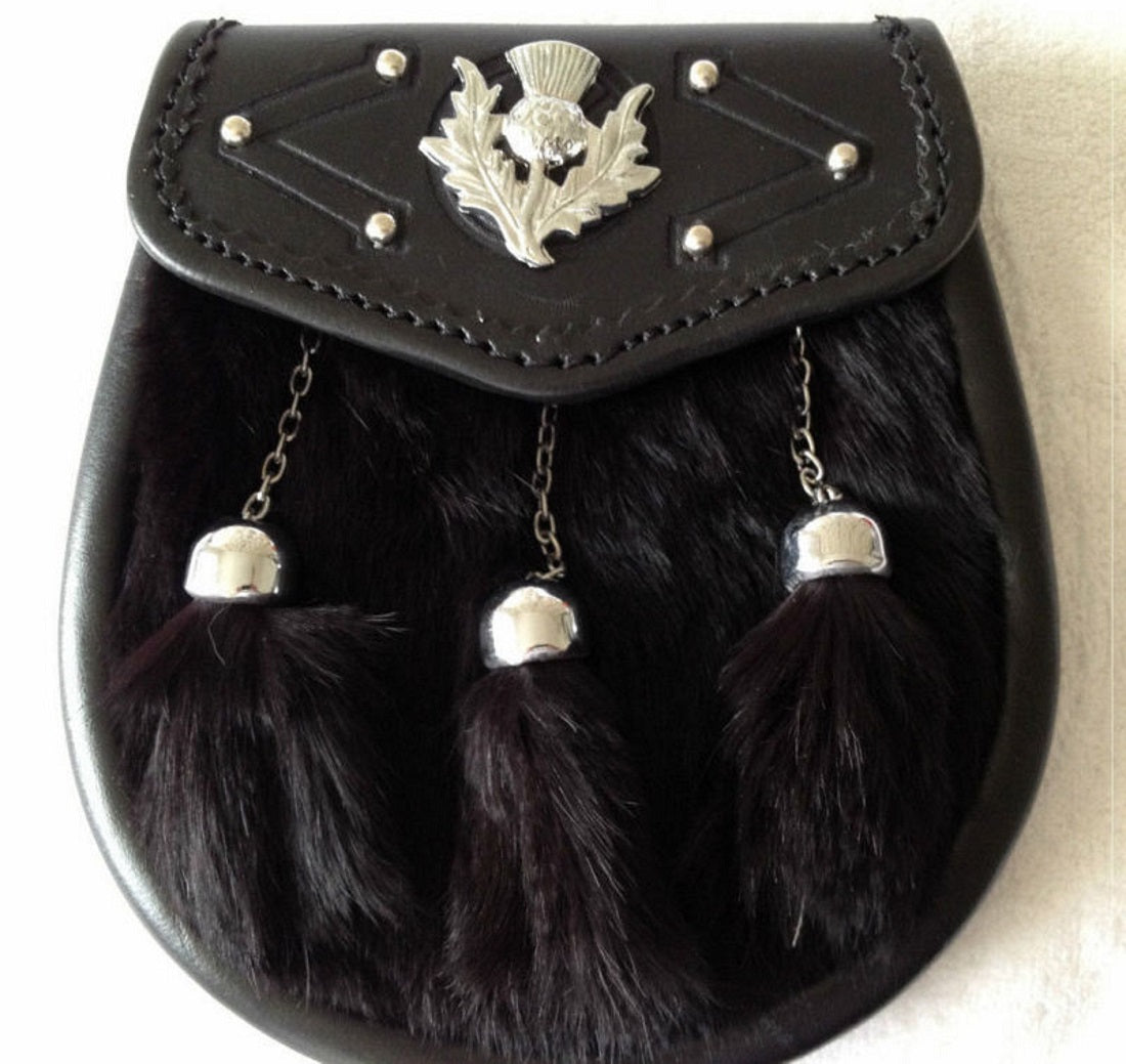 KILT SPORRAN THISTLE CREST BLACK RABBIT FUR 3 TASSLES CHROME EMBOSSED SPORRAN