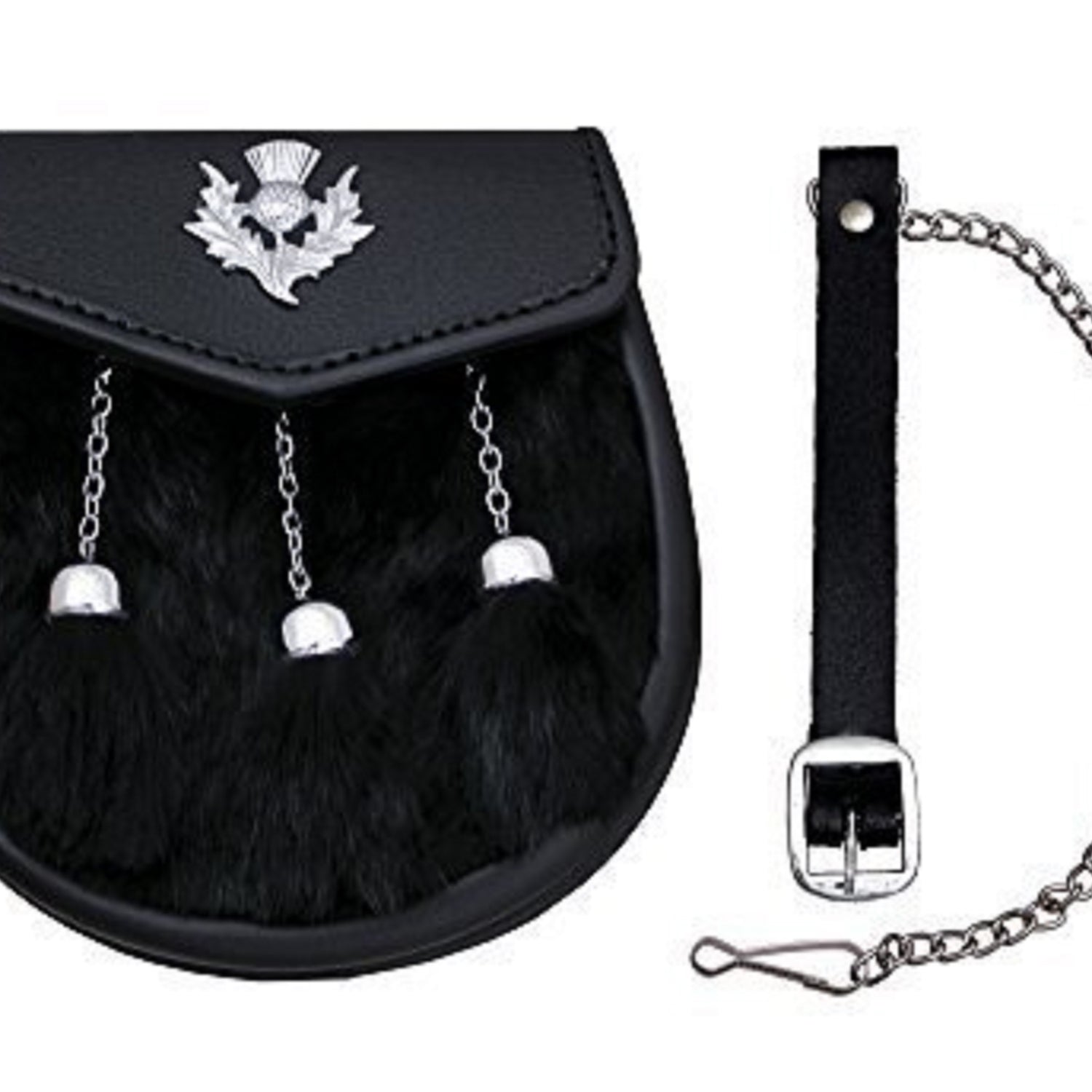 KILT SPORRAN THISTLE CREST BLACK RABBIT FUR 3 TASSLES CHROME SEMI DRESS SPORRAN