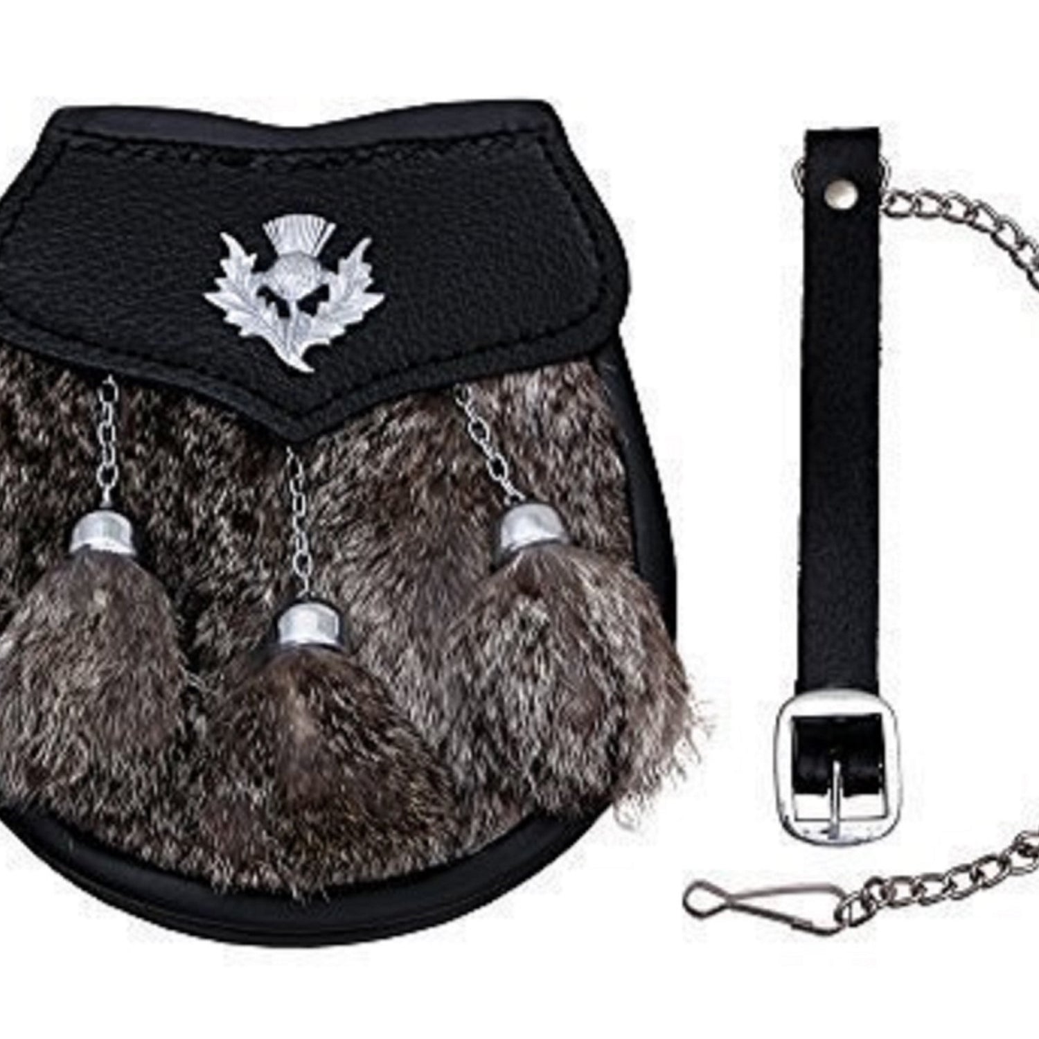 KILT SPORRAN THISTLE CREST GREY RABBIT FUR 3 TASSLES CHROME SEMI DRESS SPORRAN