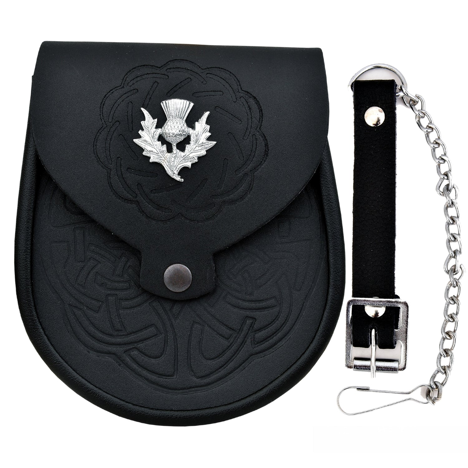 Arctic Unique sporrans made by professional craftsman experts in Scottish products. MATERIAL: Black Leather Sporran Celtic Embossed. Made of 100% pure premium leather. CHAIN STRAP: Brass Chrome Finish Chain Strap....