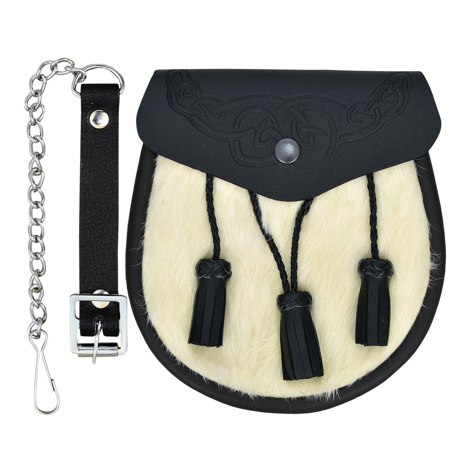 Arctic Unique sporrans made by professional craftsman experts in Scottish products. MATERIAL: Black Leather Sporran. Made of 100% pure premium leather. CHAIN STRAP: Brass Chrome Finish Chain Strap. Free chain...