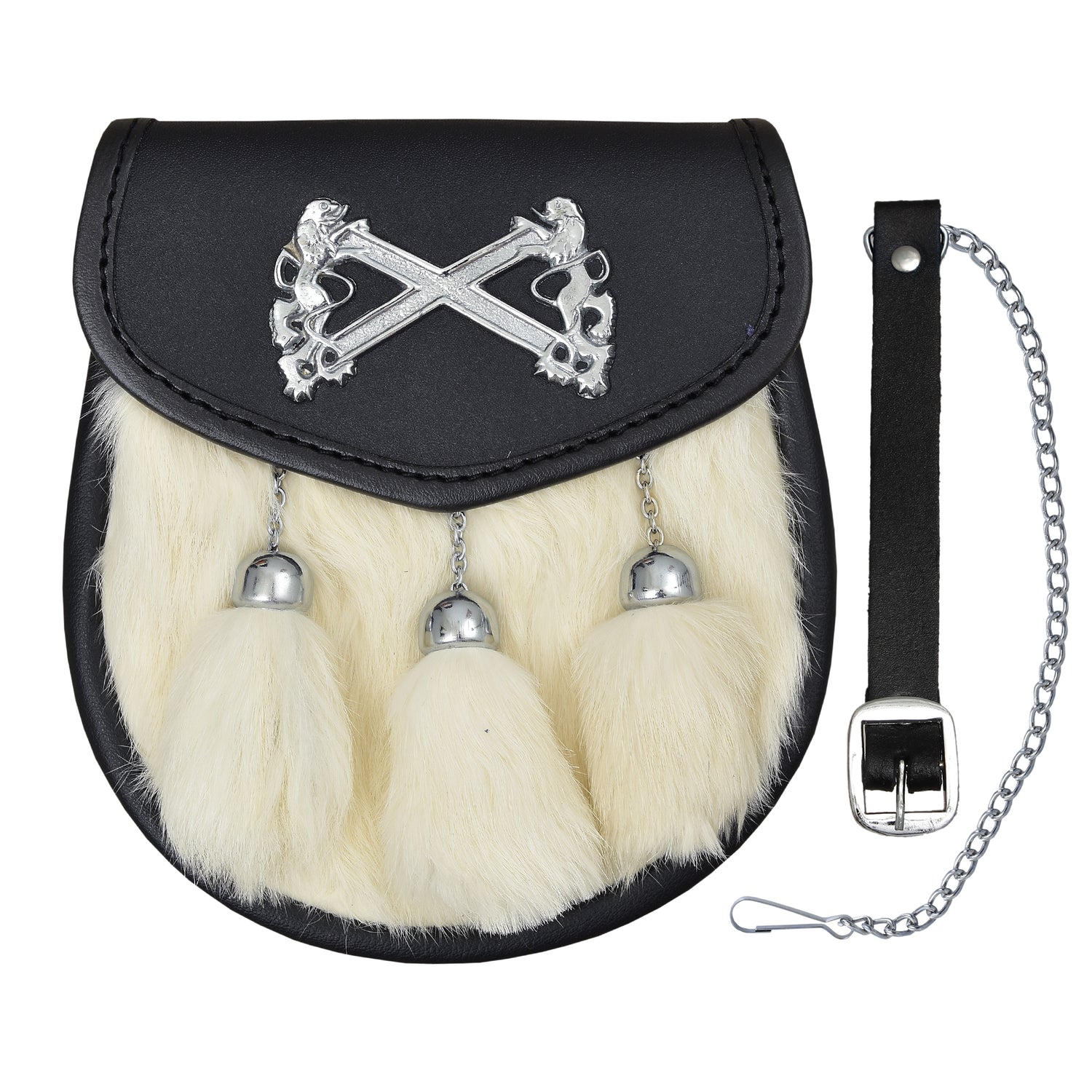 Arctic Unique sporrans made by professional craftsman experts in Scottish products. MATERIAL: Black Leather Sporran. Made of 100% pure premium leather. CHAIN STRAP: Brass Chrome Finish Chain Strap. Free chain...