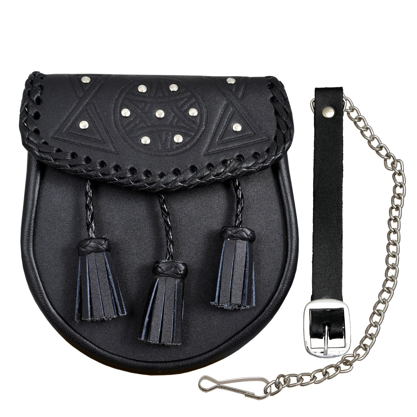 Arctic Unique sporrans made by professional craftsman experts in Scottish products. MATERIAL: Black Leather Sporran Celtic Embossed. Made of 100% pure premium leather. CHAIN STRAP: Brass Chrome Finish Chain Strap....