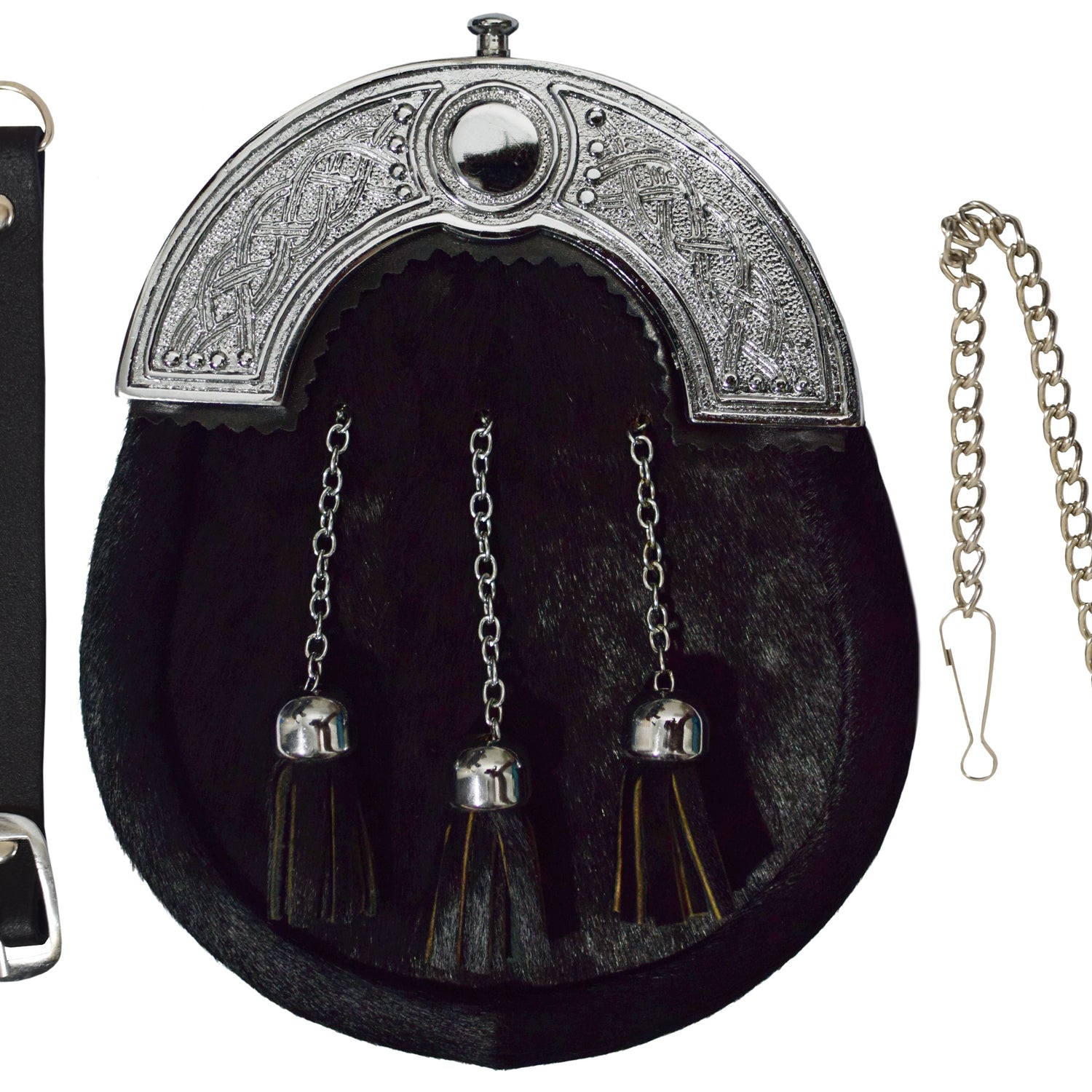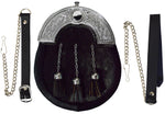 SCOTTISH FULL DRESS SPORRAN BLACK CALF SKIN WITH TASSELS & CHROME CANTLE